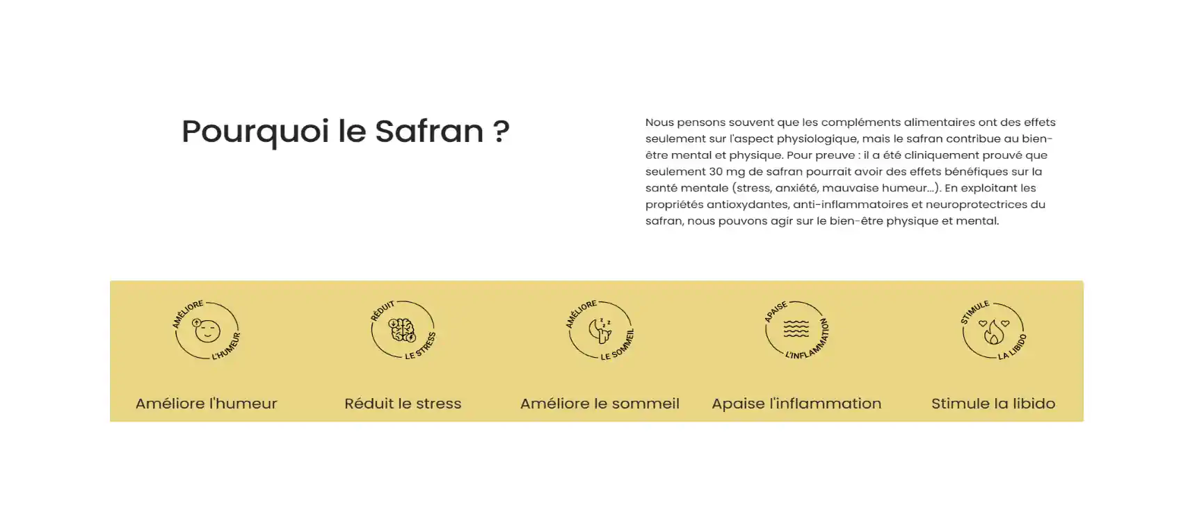 « De nombreuses études mettent en avant le Safran pour ses bienfaits contre la dépression. Une solution naturelle et prometteuse sans les effets souvent associés aux traitements conventionnels (recapture de la sérotonine (ISRS) qui entraine un dysfonctionnement sexuel par exemple). De nombreuses études ont confirmé l’efficacité du safran dans le traitement de la dépression légère à modérée. »