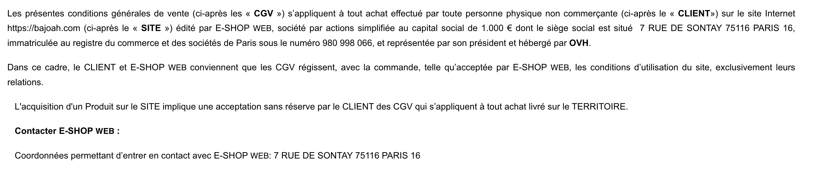 Sur son site internet, nous pouvons voir que la marque BAJOAH appartient à la société francaise SAS E-SHOP WEB, elle-même dirigée par Ron Boccara.