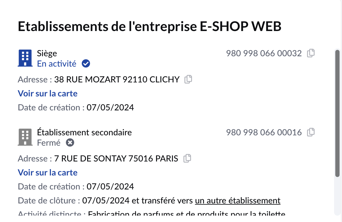 Premier mauvais point concernant les conditions générales de vente qui ne semblent pas correctes (selon le site Pappers) : L’adresse indiquée sur le site pour pouvoir entrer en contact avec la SAS E-SHOP WEB a changé depuis le 7 mai 2024 mais cela n’a pas été mis à jour dans leurs conditions générales de vente.